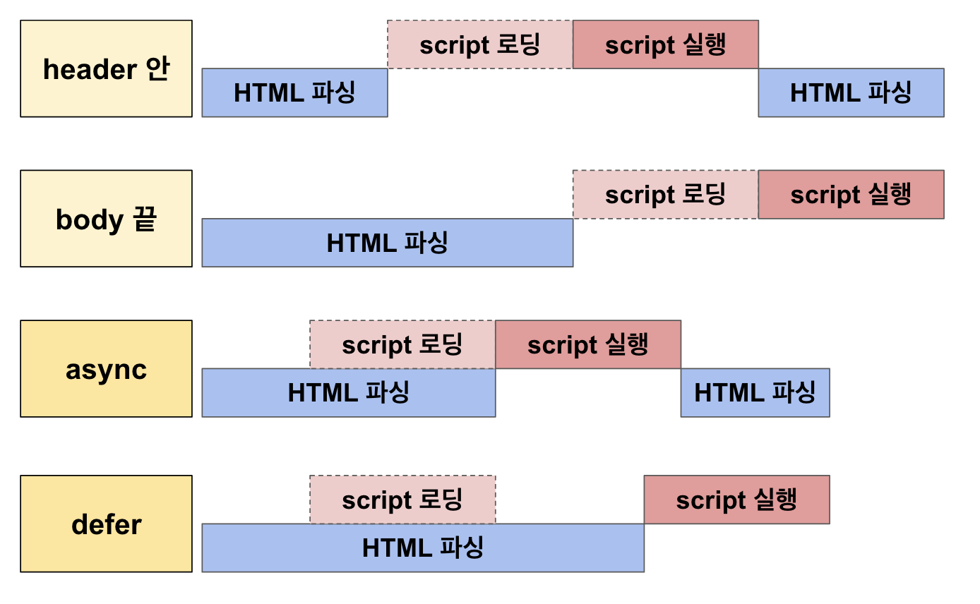 각각의 방법을 확인하면, html 파싱과 script 로딩과 실행 순서에 조금씩 차이가 있음을 알 수 있다.
